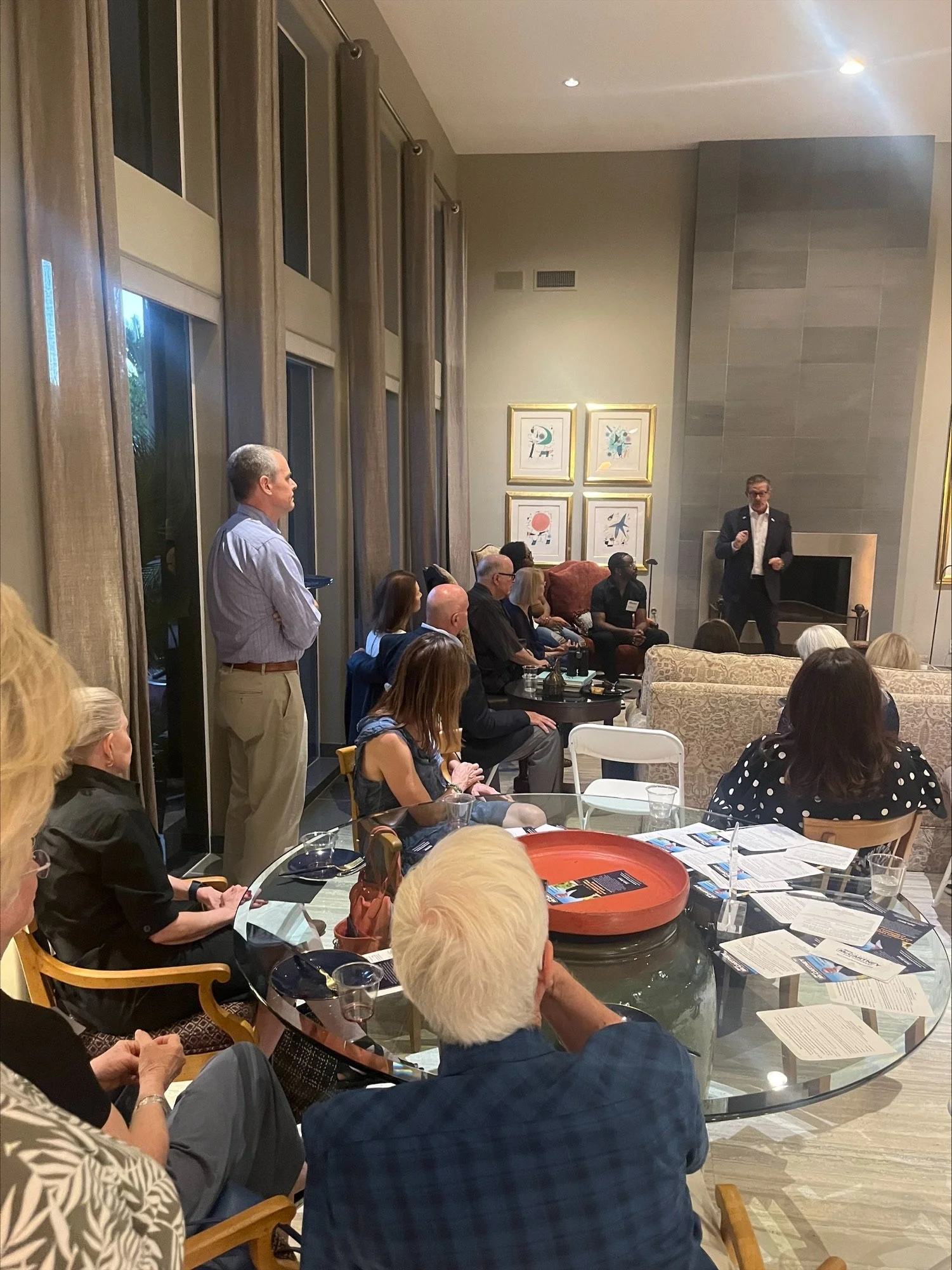 A fundraising event in Paradise Valley with a town hall with Rick McCartney discussing immigration issues, healthcare issues, and protection of the press and public radio and freedom of speech with attendees.